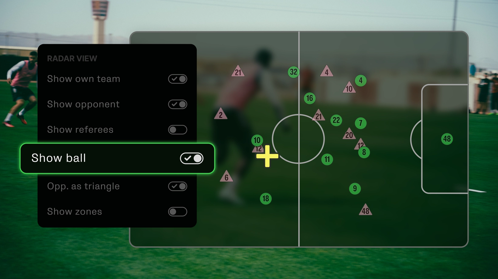 対象はVeo Analyticsユーザーで、2025年8月19日以降にアップロードされた試合映像では、2Dレーダー上にボールの位置を表示することができるようになった。